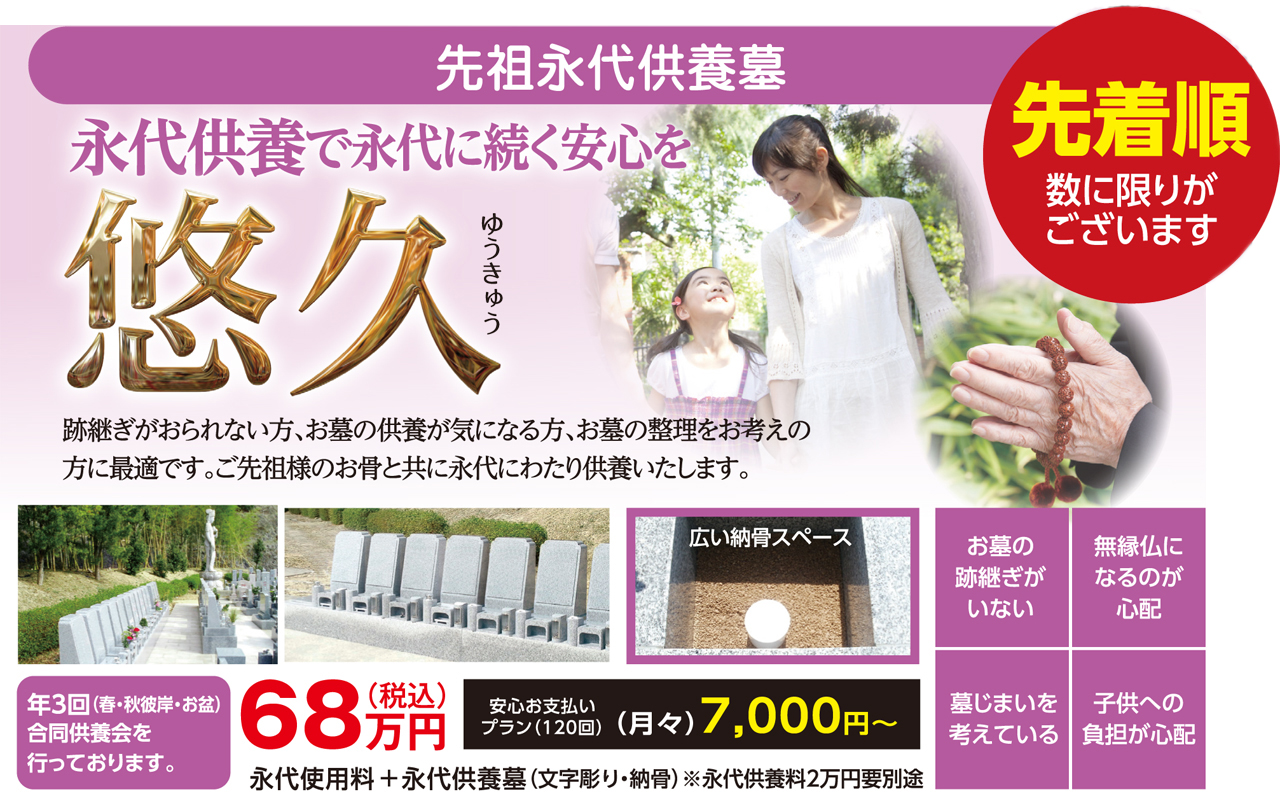 先祖永代供養墓「悠久」 ご家族、ご先祖ごとに眠っていただける先祖供養型永代供養墓です。 永代供養の期限はございません。 合同墓ではないので、一家ごとに独立納骨ですので安心です。 生前予約もできますので、お気軽にご相談ください。